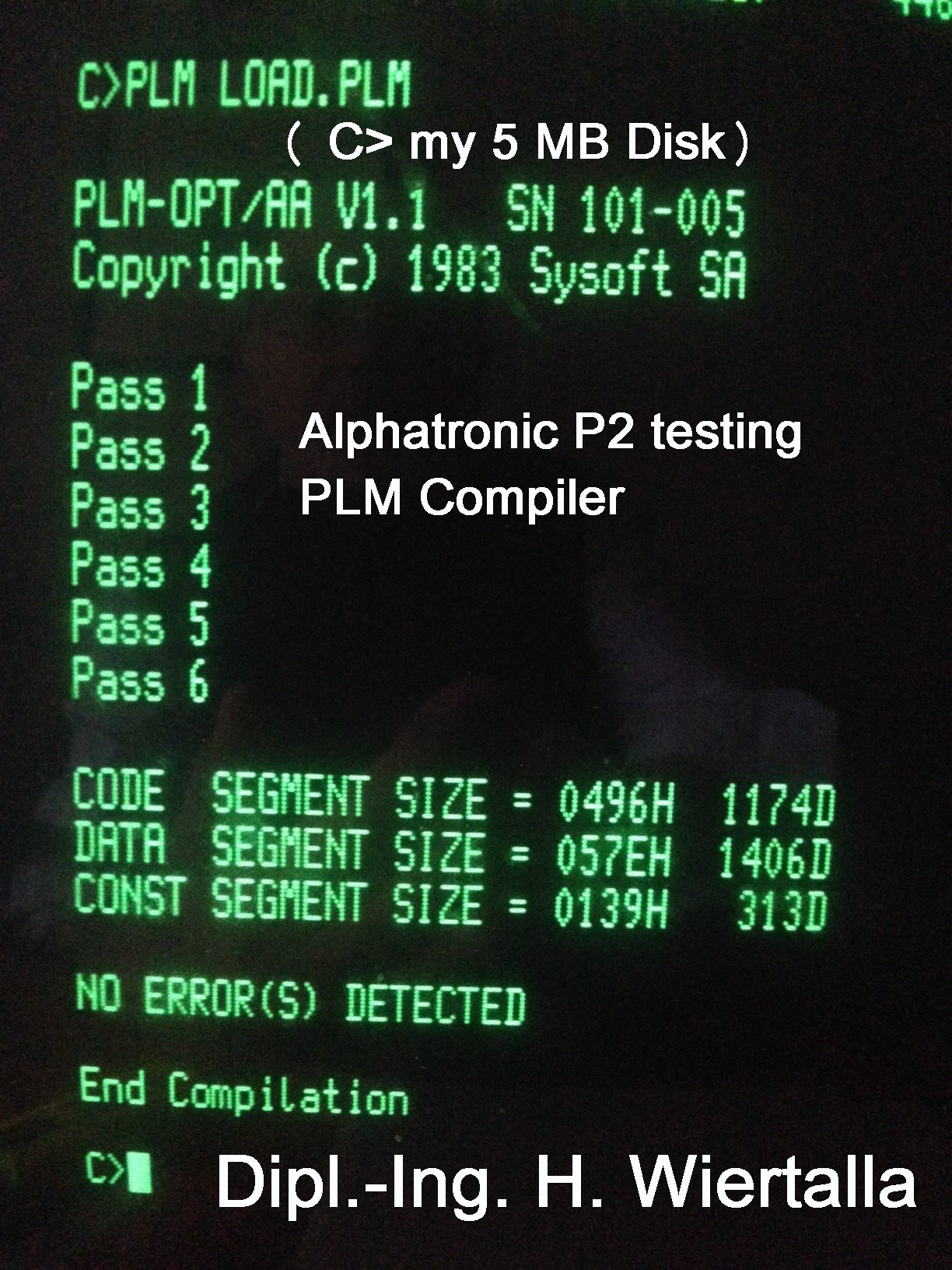 der cp/m Microrechner Alphatronic P2 von Triumph Adler, KISS, DE10 sks , und die Datensichtgeraete der Fa. Dr.-Ing. R. HELL, Kiel mit dem DS2069. ![]() Dipl.-Ing. Helmut Wiertalla Alphatronic P2: Freunde und/oder USER hier sollte man die vielen Informationen sichten, um die von mir abgelegten Files auf den eigenen PC zu sichern. In der historischen Mikrorechner - Sammlungen sollte Unterlagen und Softwarewerkzeuge für eine Alphatronic P2 nicht fehlen. Was man jetzt an Unterlagen bisher nicht gesichert hat, ......! "FUNDGRUBE ALPHATRONIC P2" . Ich habe noch z.B. einen PLM-Compiler mit Dokumente unter cp/m (64 kB RAM) - damit sollten die PLM-Quellen wie ED.PLM, STAT.PLM, PIP.PLM, LOAD.PLM usw. von DR "Digital Research" übersetzbar sein. Mit STAT.PLM lief alles astrein durch. Wer hätte gerne ein Tool für die Alphatronic P2? Unmögliches wird sofort erledigt ! A genius controls the chaos. |
