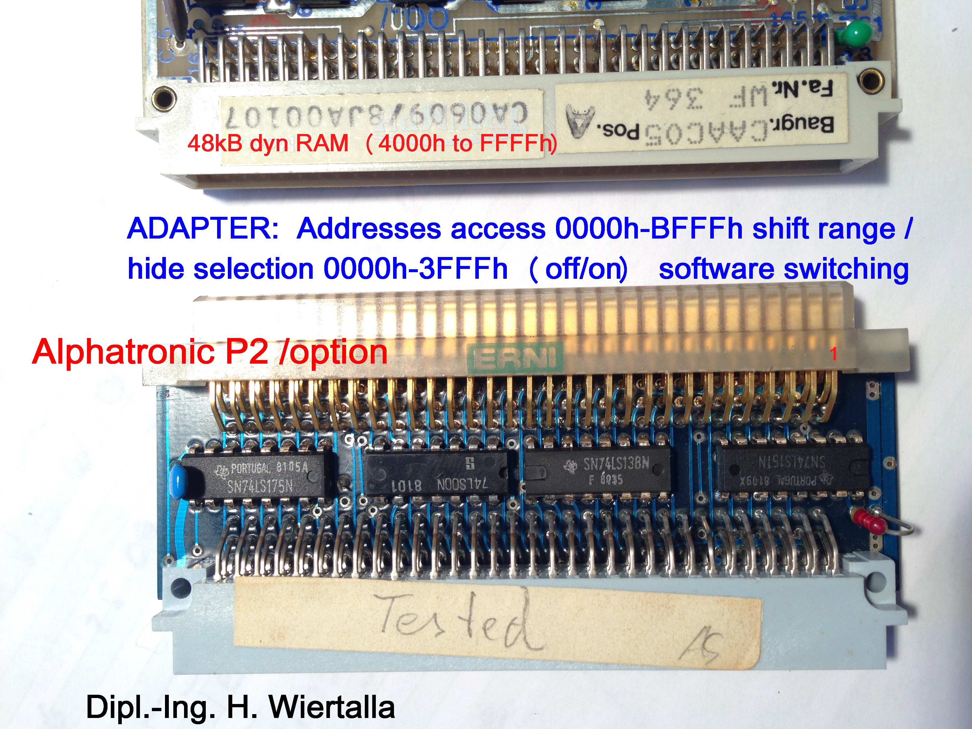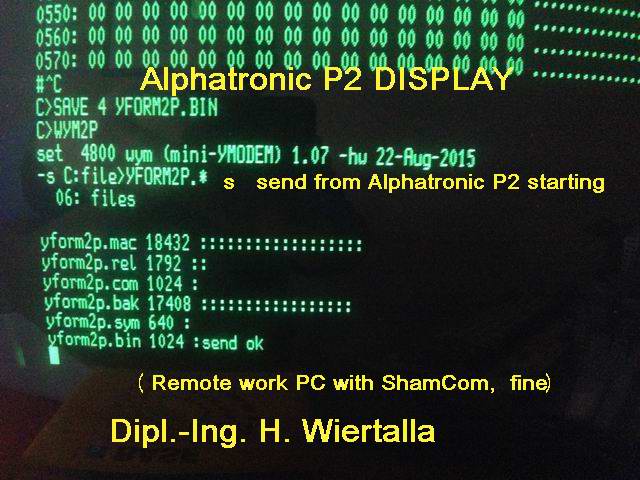 Kochrezept: Alphatronic P2 Übersicht / overwiev (update 14.nov.2015) Mit wenig Handarbeit hauchen Sie der Alphatronic P2 wieder das Leben ein. So geht es --> dort Anleitung z. B. So sind nach einem Hard-RESET, folgende Speicherbereiche benutzbar. Studieren (update 11.oct.2015) Sie die Speicher-map und die Memory-Optionen bei einer Alphatronic P2. Was man haben (besorgen) sollte: Eine Alphatronic P2 (ok-Hardware !) Beschreibbare DD Disketten (160kb) Ein V24-Drehkabel 25pol. zur P2. ![]() Zur anderen V24- Seite 25 oder 9 pol. eine Verbindung zum PC. WIN Programm TeraTerm (freeSoftw. z.B.) Einen eigenen PC mit V24 Verbindung und zum Internetzugang - auf diese WEB Site /und oder mehr. Noch die Anleitung von mir und etwas Handarbeit damit Sie ein cp/m und einige Programme auf eine Diskette für eine Alphatronic P2 speichern können. Im HELPER Bereich ist ein Schema um ein COLD FORMATTER in die Alphatronic P2 zu laden (RAM runfähig) - es geht los. Später benutze ich lieber als PC-Programm ShamCOM gegn die Alphatronik P2 dort mit meinem YMODEM-Programm wym2p.com. ![]() Wenn alles per V24 im RAM liegt, speichern mit dem MOS. .U4370,FC00(cr) If you have permanent floppydisk read-write problems - then show to HELPER part. ![]() |