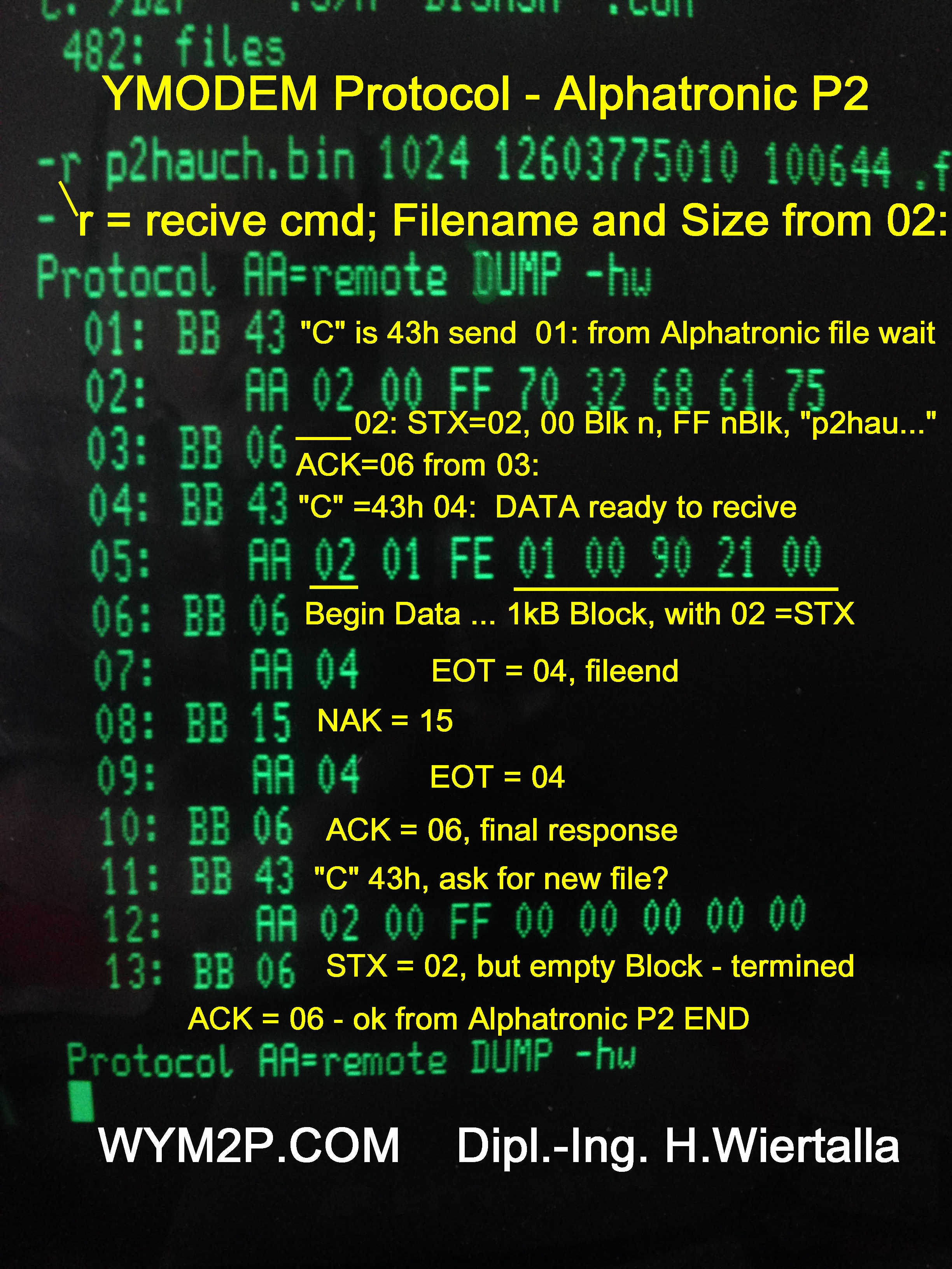 Alphatronic P2 /P1 (TA) hier entwickelt bei sks SKS) Steinmetz- Krischke- Systemtechnik Basiswissen in Unterlagen (pdf's) und ein Schlüsselprogramm wym2p.com (nach dem YMODEM von mir geschrieben). Wie geht das, um den Zugriff auf den transparenten File-Transfer zu machen? Hier mit dem wym2p.com - Programm (Wiertalla entwickelt) geht es einfach, vom/zum PC - und einer Alphatronic P2 - in beide Richtungen ganz simpel!. Ein Beispiel im Bild unten. ![]() wym2p.com - Programm Für Fortgeschrittenen USER ein kleines Beispiel zum Protocol DUMP YMODEM A genius controls the chaos. FORUM to P2 and more. |